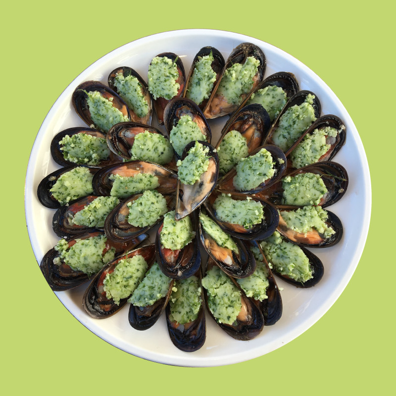 Moules d'Espagne cuisinées à l'ail & au persil, prêtes à être gratinées au four à 180 degrés pendant 5 min.